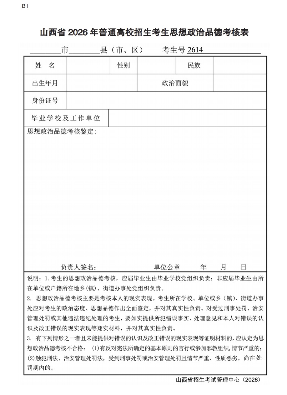 2026年山西省高考报名思想政治品德表下载
